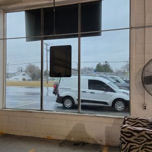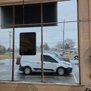 Our Beautiful one way Mirror film is a perfect privacy addition! Not only is it blocking the view from the outside, it is also tremendously blocking the glare from coming into the windows. This is IG Burtons Body Shop and they were getting blinded by the sun! Now they dont have to worry about the overwhelming heat as well from coming in through the glass! This film is blocking 83% of the heat from coming in! It is also blocking 99.9% of the harmful UV Rays.